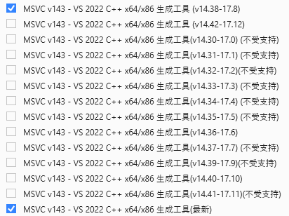 MSVC版本,使用’MSVC v143 - VS 2022 C++ x64/x86 生成工具(v14.38-17.8)’这个版本: