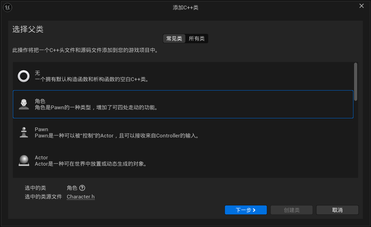 接下来创建一个C++类用于表示游戏中的角色,这里暂时使用默认的Character,因为2D角色主要就是把骨骼组件改为成了Sprite,动画组件变为FlipBook,其余地方没有太多区别,而正式创建2D角色会用到PaperZD这个插件,所以就先用默认的Character展示