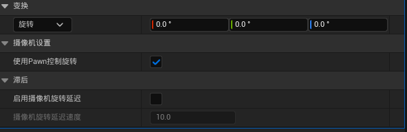 我们先把之前的几个设定取消勾选,然后开启使用Pawn控制旋转,注意,虽然这里写的是摄像机设置,但实际是SpringArm中的选项,而不是摄像机中的(摄像机也有相同的选项)