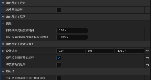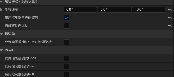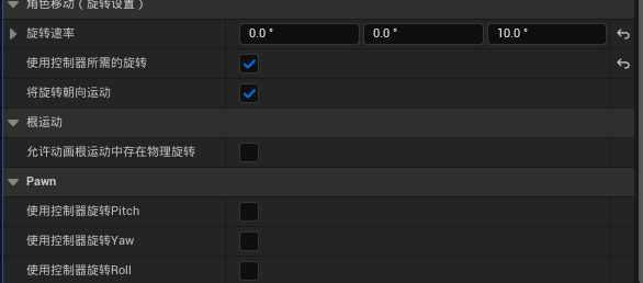 将控制器和角色朝向关联起来的关键就是这三个设置,其中使用控制器所需的旋转或使用控制器旋转YAW二者的功能是一致的,当勾选之后,角色朝向会和控制器的正方向绑定