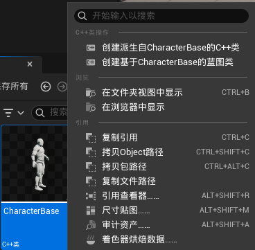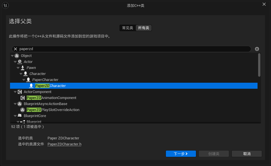 由于使用的是第三人称模板,所以出于方便都是用的3D角色做的实验,现在正式使用PaperZD来实现2D角色(第三方插件),创建一个继承自PaperZDCharacter的类PaperCharacterBase