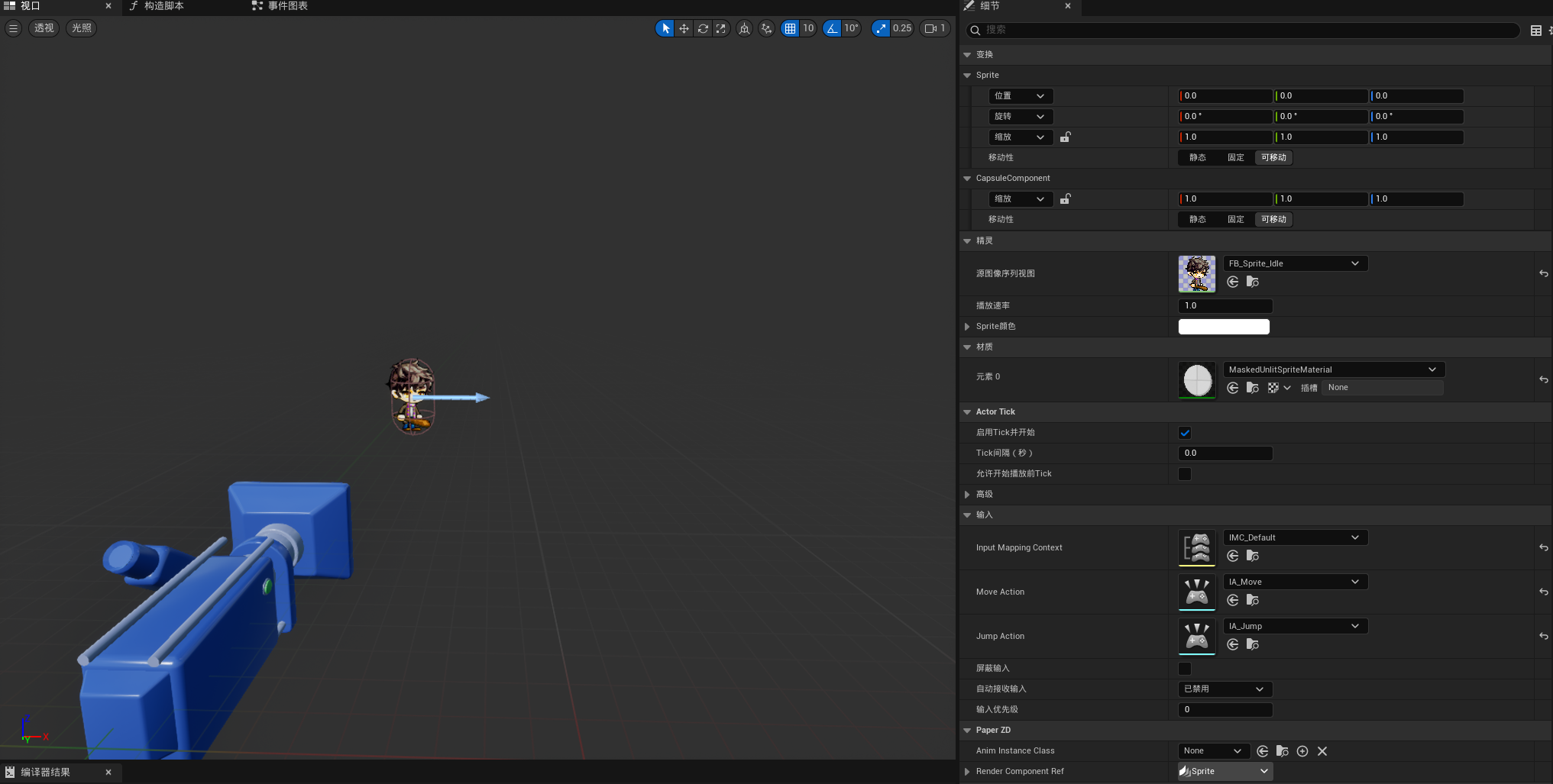 同样的,需要创建一个继承自PaperCharacterBase的蓝图类BP_PaperCharacterBase,并在GameMode中把默认Pawn修改过来