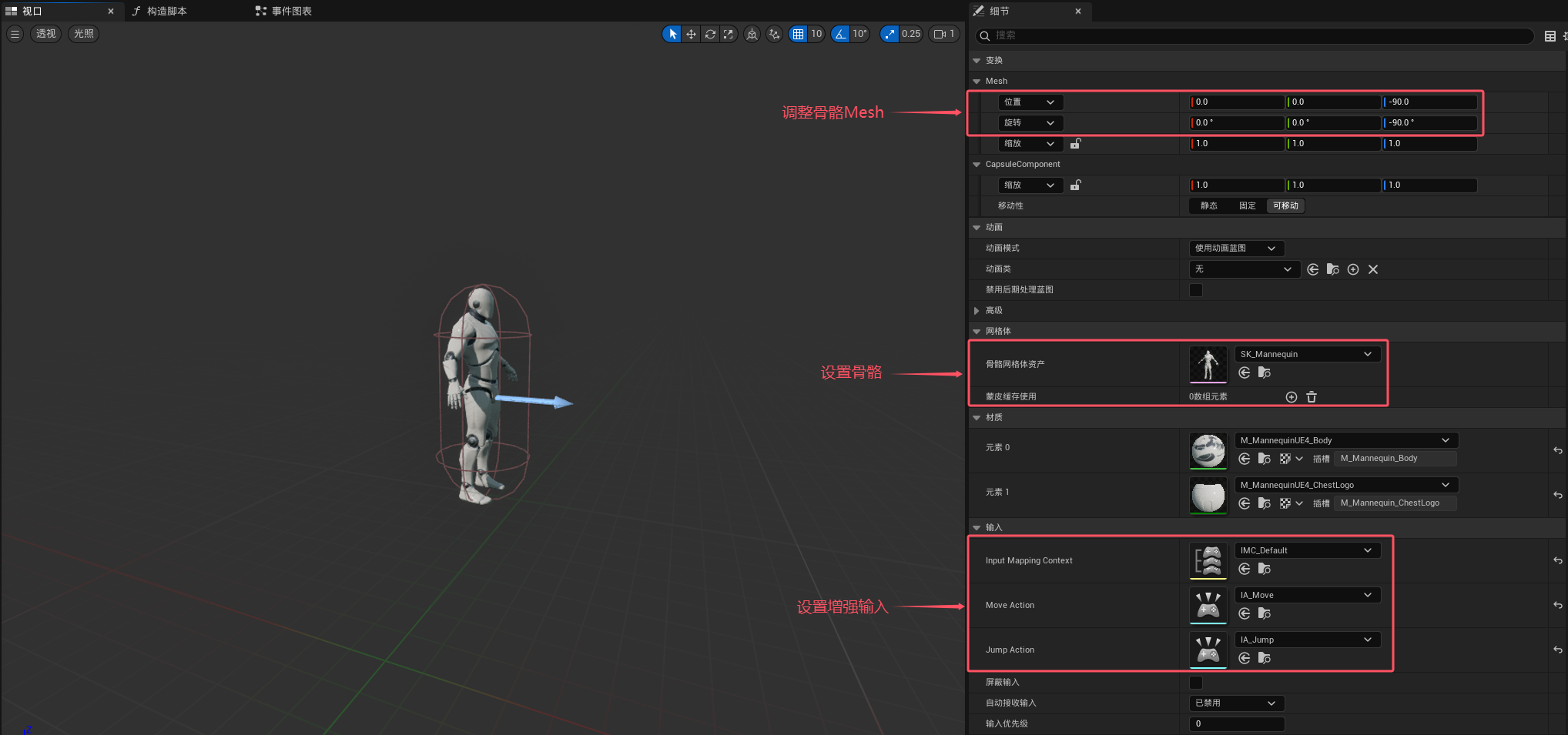 之后创建一个基于CharacterBase的蓝图类BP_CharacterBase,并添加之前制作好的IMC_Default、IA_Move和IA_Jump,因为我们没有用代码加载它们,所以需要手动设置一下(如果你之前没有用代码调整胶囊组件和骨骼组件的部分配置,那么也可以在这里设置)