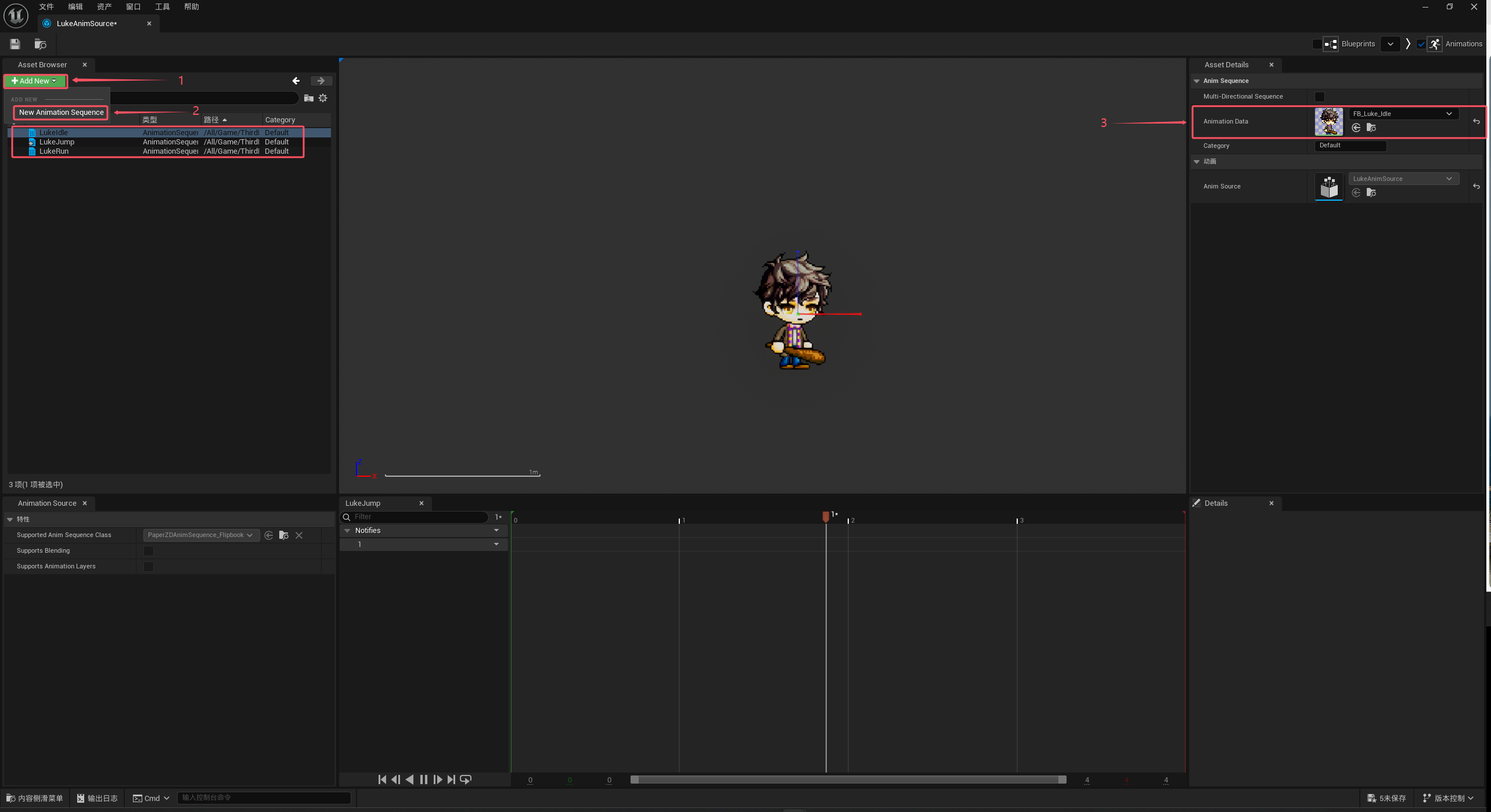 Note: 选择Animation Sequence的操作有点反直觉,必须要双击才能切换过去,单击只是选中,可以观察图中,左侧虽然选中了LukeIdle,但当前打开的是LukeJump(时间轴左侧有当前打开的Animation Sequence名称)