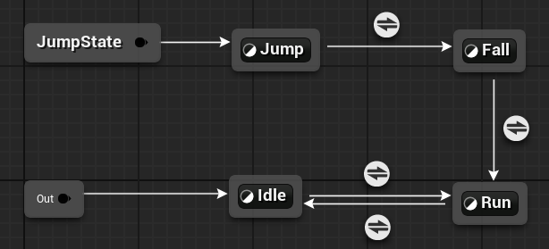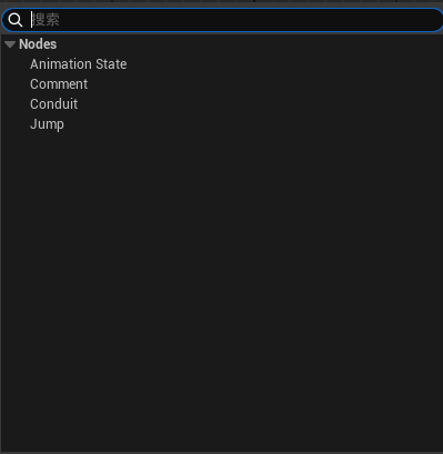 考虑到我们既可以通过判断z轴的速度转移到Jump状态,也可以通过跳跃事件的触发转移到Jump状态,所以动画状态机还可以有如下的实现方式,我们创建了一个Jump节点,然后重命名为JumpState