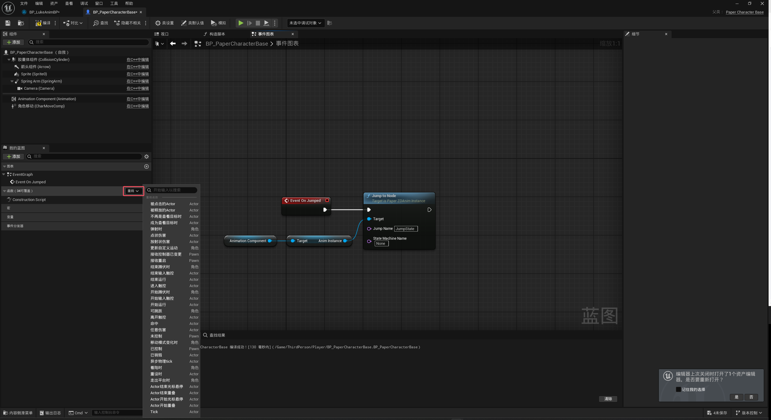 之后我们来到BP_PaperCharacterBase中,点击标注的位置找到跳跃时,即可像图中一样设置On
