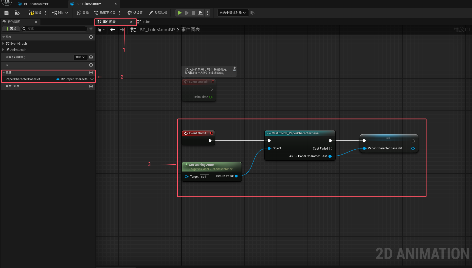 接下来是状态转移条件的设置,可以想到,如果我们知道角色在X轴和Z轴上的速度,就可知道角色应该转移至什么样的状态,因此,我们来到BP_LukeAnimBP中的事件图表,之前我们已经完成了角色和状态机的绑定,那么我们可以通过Get Owning Actor来获取,然后将其转换为BP_PaperCharacterBase类型,并将结果提升为变量方便后续使用,这里我们将变量重命名为PaperCharacterBaseRef