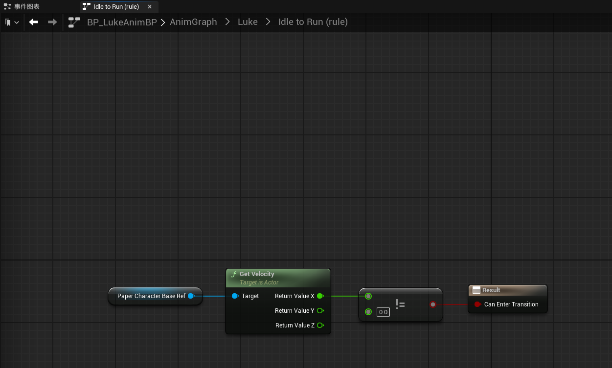 现在我们回到动画状态机中,以Idle->Run这个状态转换为例,获取一下速度,如果X轴的速度不为0,那么就可以转移至Run状态